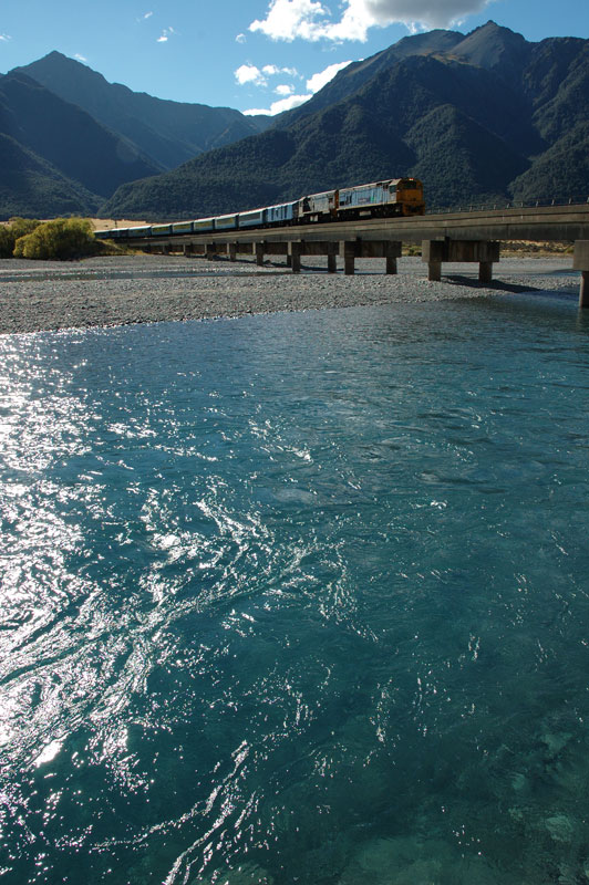 クライストチャーチを出発した列車は、カンタベリー平野をひた走り、スプリングフィールドを過ぎた辺りから川沿い区間に突入する。Kowai川の鉄橋を渡り、次に見えてくるのがしばらく併走するWaimakariri川だ。Otarama渓谷などWaimakariri川が作り出した渓谷美を眺めながら、線路はWaimakariri川と一旦別れ、支流のBroken川沿いへと入って行く。そして、さらに支流沿いへと進み、少しの区間川から離れるが、またWaimakariri川に近づいて行く。トンネルを越えると、Otira川がすぐに見える。しばらくOtira川の流れとともに下り、Brunner湖を過ぎ、終着駅のグレイマウスが近づくと、Grey川が見えてくる。ニュージーランドの南島の川は、氷河を基点としているからか、エメラルドグリーンに見えることが多い。Waimakariri川もそのひとつだ。そして、言うに及ばないが水はきれいだ。